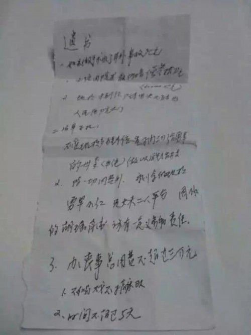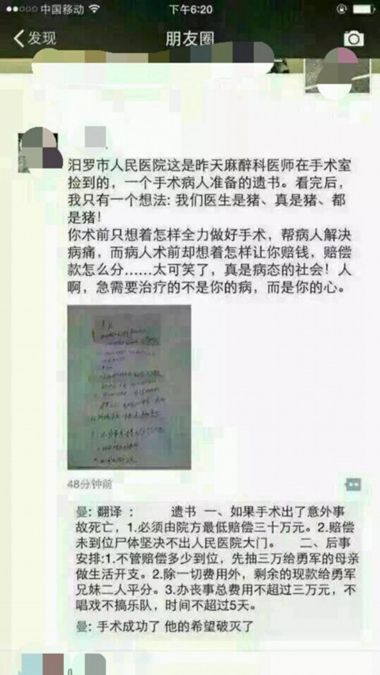 5月9日,有网友爆料称,湖南省汨罗市人民医院医生在手术室捡到病人的遗书,病人在遗书中叮嘱子女,如果手术意外,导致死亡,必须索要不低于30万元赔偿,否则遗体绝不移出医院大门,病人对赔偿款的分配做了详细的安排。