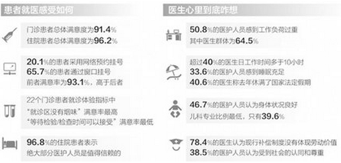 调查显示,门诊患者的总体满意度为91.4%,住院患者的总体满意度为96.2%。这两个满意度指标都比2013年第五次全国卫生服务调查结果高。与国际上患者满意度的调查结果比较,中国患者的满意度并不低。