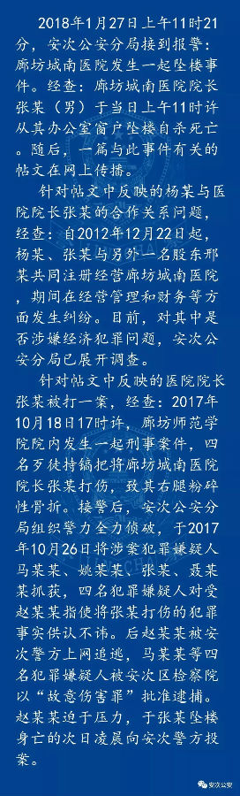 1月27日上午11时,廊坊城南医院院长张毅从其办公室窗户坠楼自杀身亡。